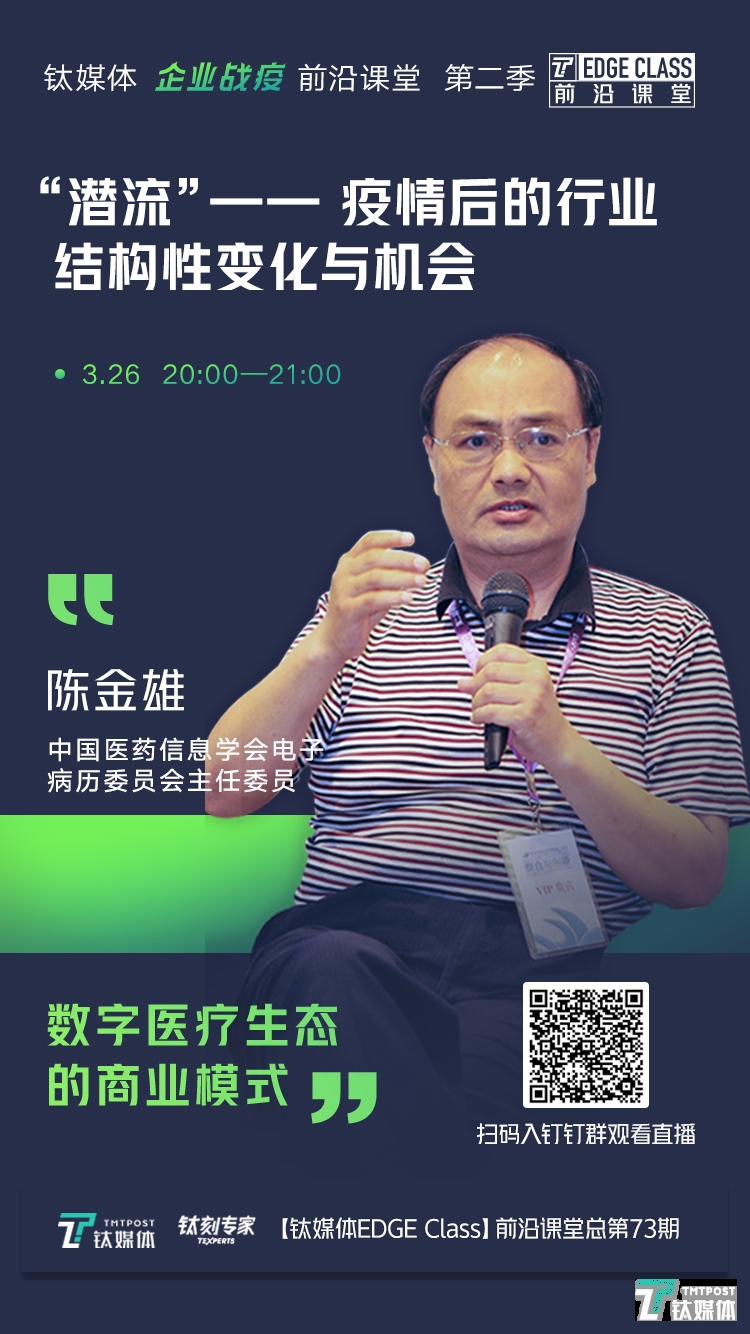 “企业战疫”前沿课堂第二季,陈金雄将进一步讲解未来数字化医疗生态下有哪些市场机会,并且该如何找准商业模式。