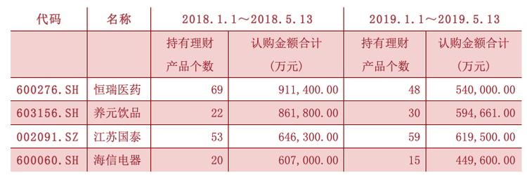 (图为2018、2019年同期购买理财产品认购金额前十位公司<部分>)