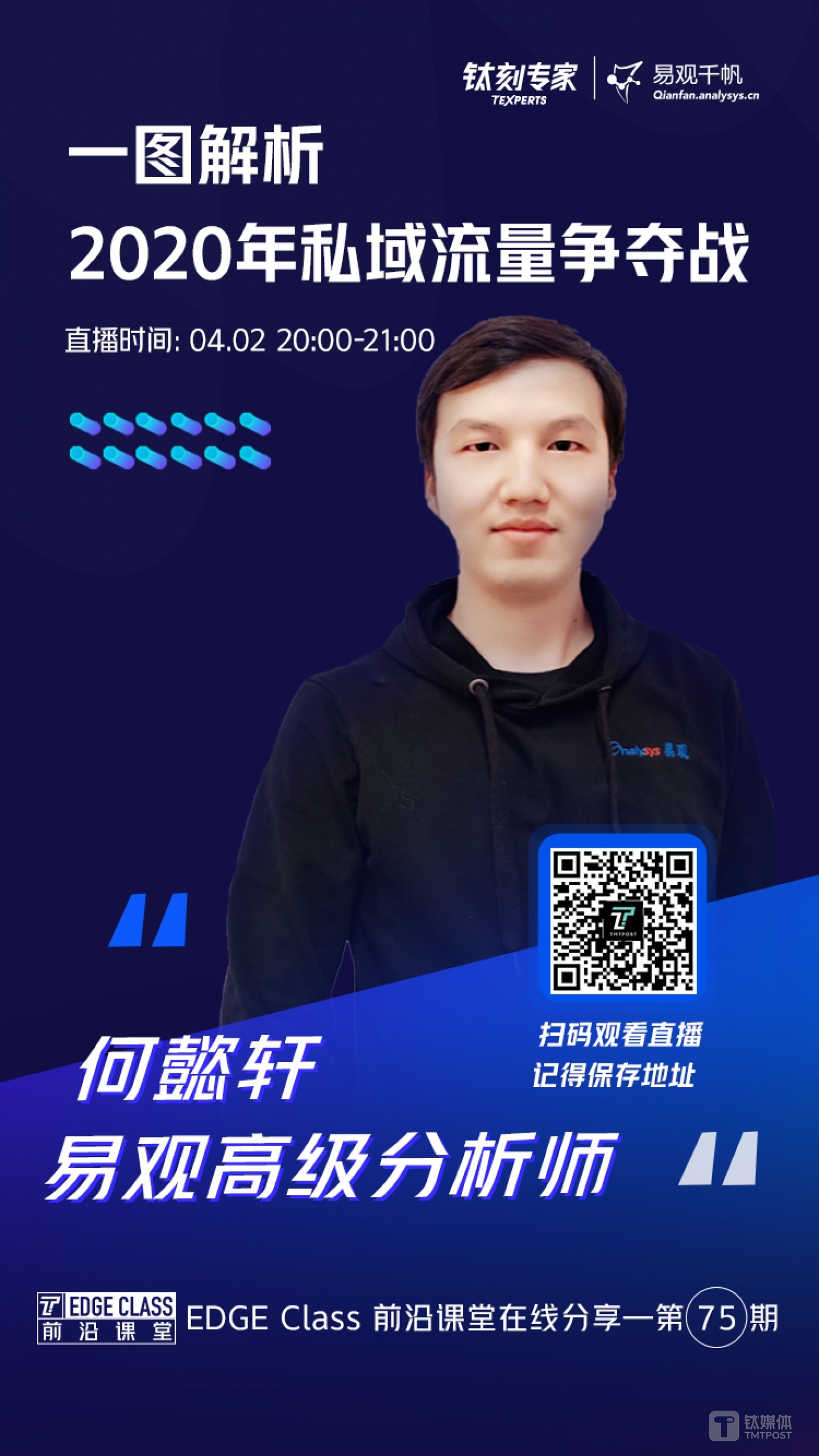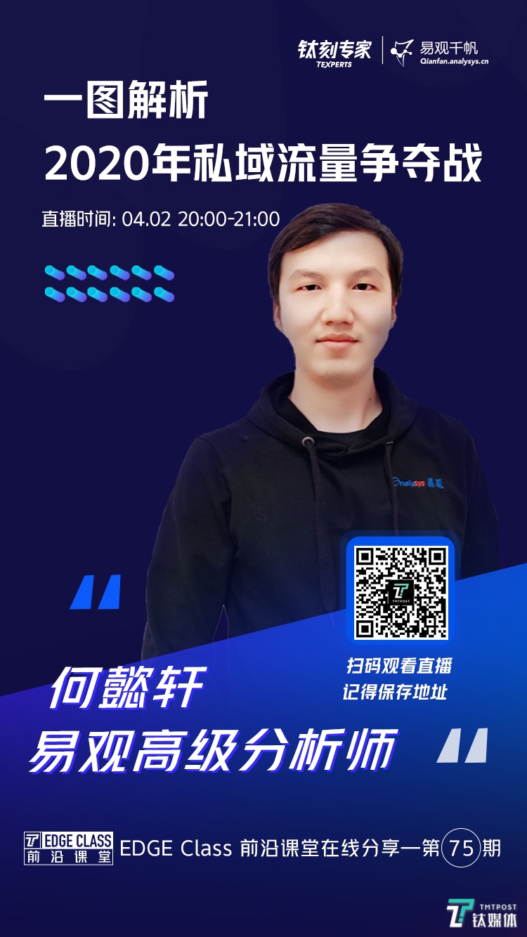 开课时间为4月2日20:00。钛刻专家联合易观千帆联合打造的分享课采用线上直播形式,扫描海报二维码即可观看直播。