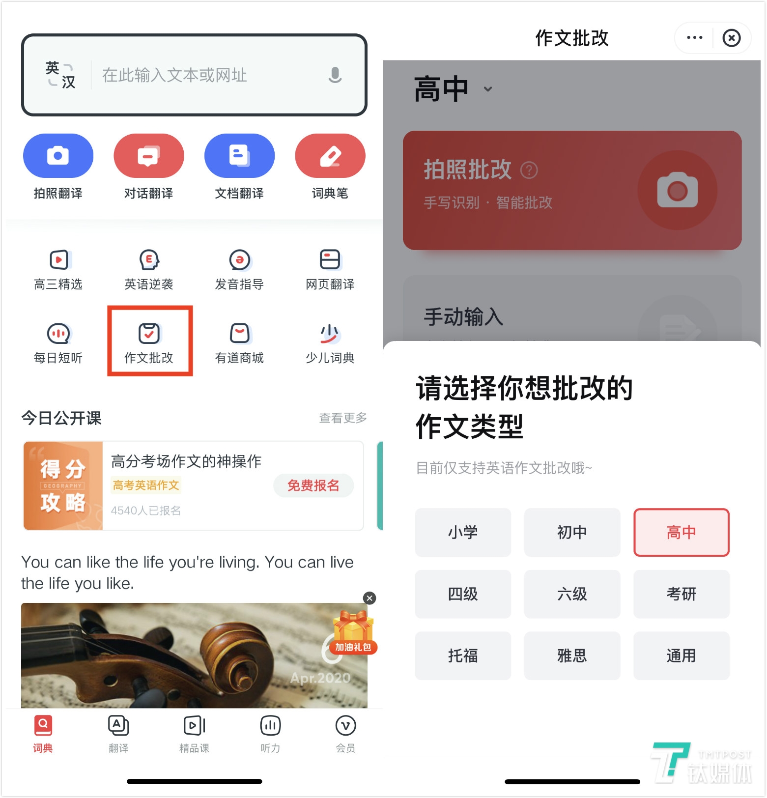 打开网易有道词典APP,“作文批改”功能已经在首页显示,一目了然。点击之后,我们可以选择可以批改的类型,范围从K12到大学四六级,以及托福雅思等出国考试,非常全面。