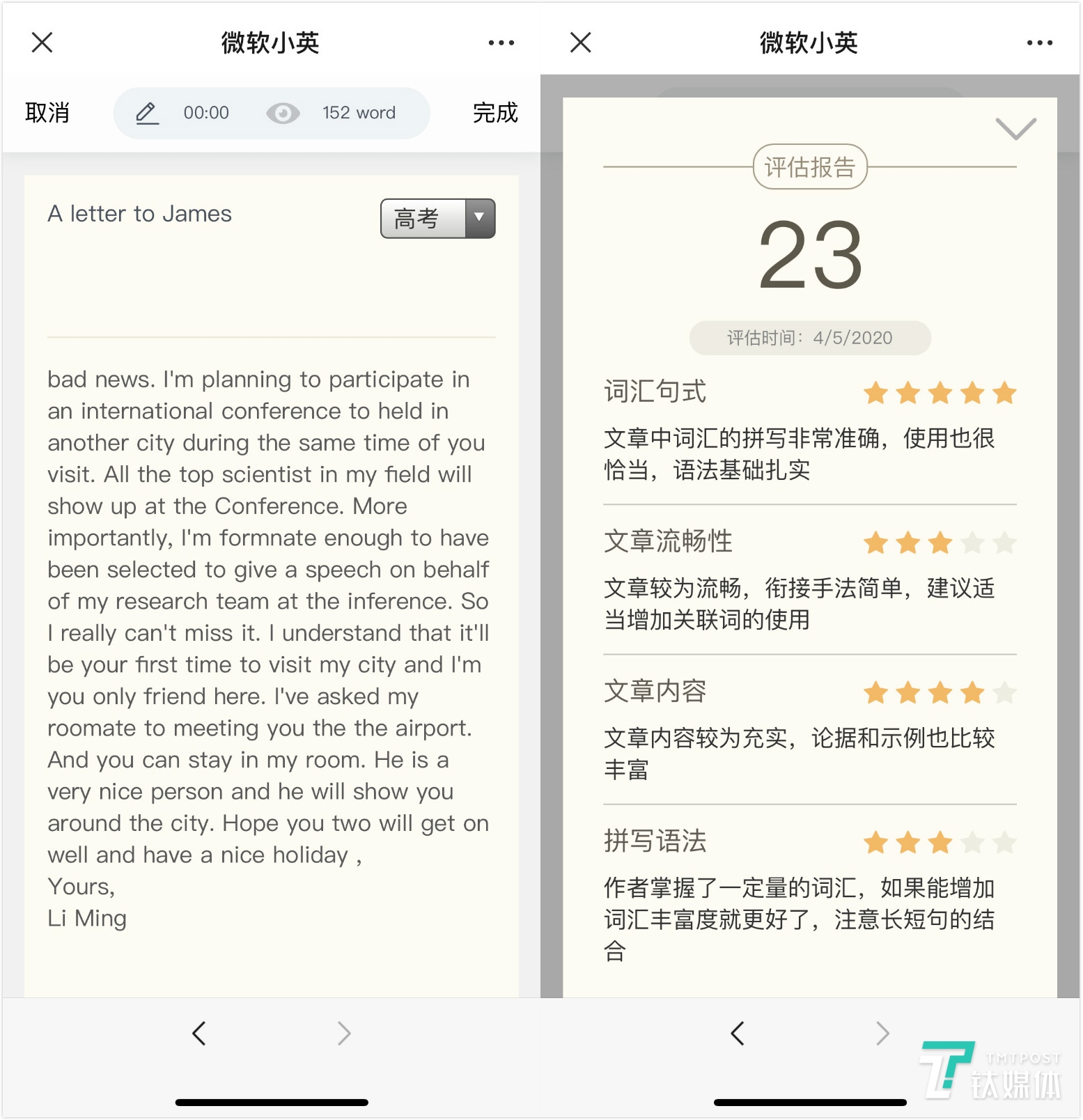 钛媒体发现,微软爱写作目前主要是网页版,还没有上线中国区的App Store的相关APP。不过,它已经嵌入了“微软小英”的公众号内。该公众号是微软亚洲研究院打造的一款免费的英语学习公众号,主打AI与英语学习相结合的体验。