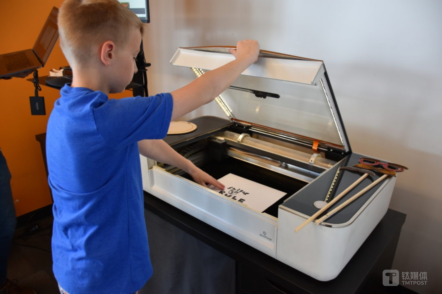 然后是喷墨打印机:它的工作原理是,利用传感器控制信号,利用这一信号传来的定位数据控制墨车在纸张上反复移动滴墨,从而形成图案。
