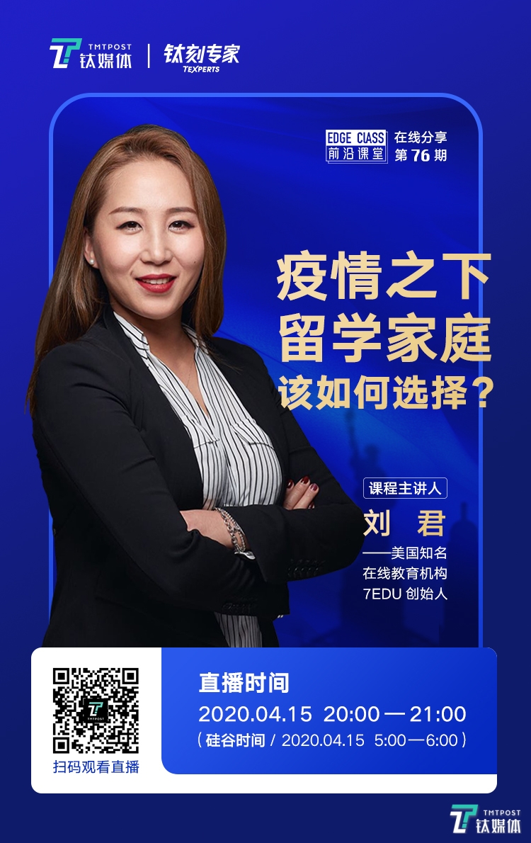 本期前沿课堂,钛媒体邀请到7EDU创始人刘君为大家带来疫情之下,留学家庭该如何选择的分享。