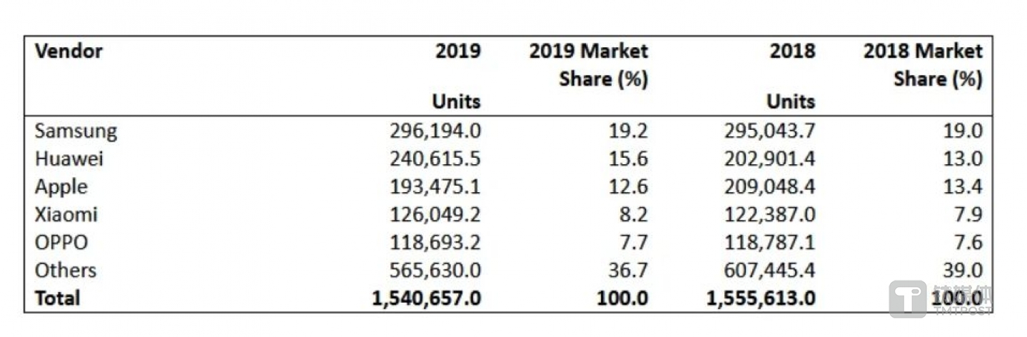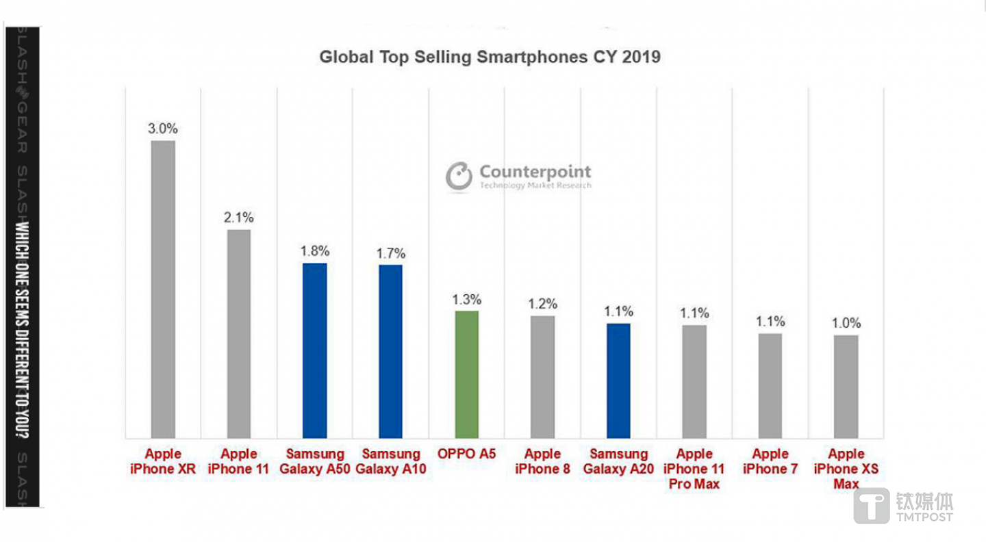 我们再来看看另外一家数据分析机构 Counterpoint 的一份报告,不是品牌排名,而是关于2019年的单机型销量排行,前十名当中苹果占据了5席,国产手机只有1款上榜,另外4款当中有3款是三星的Galaxy A系列。