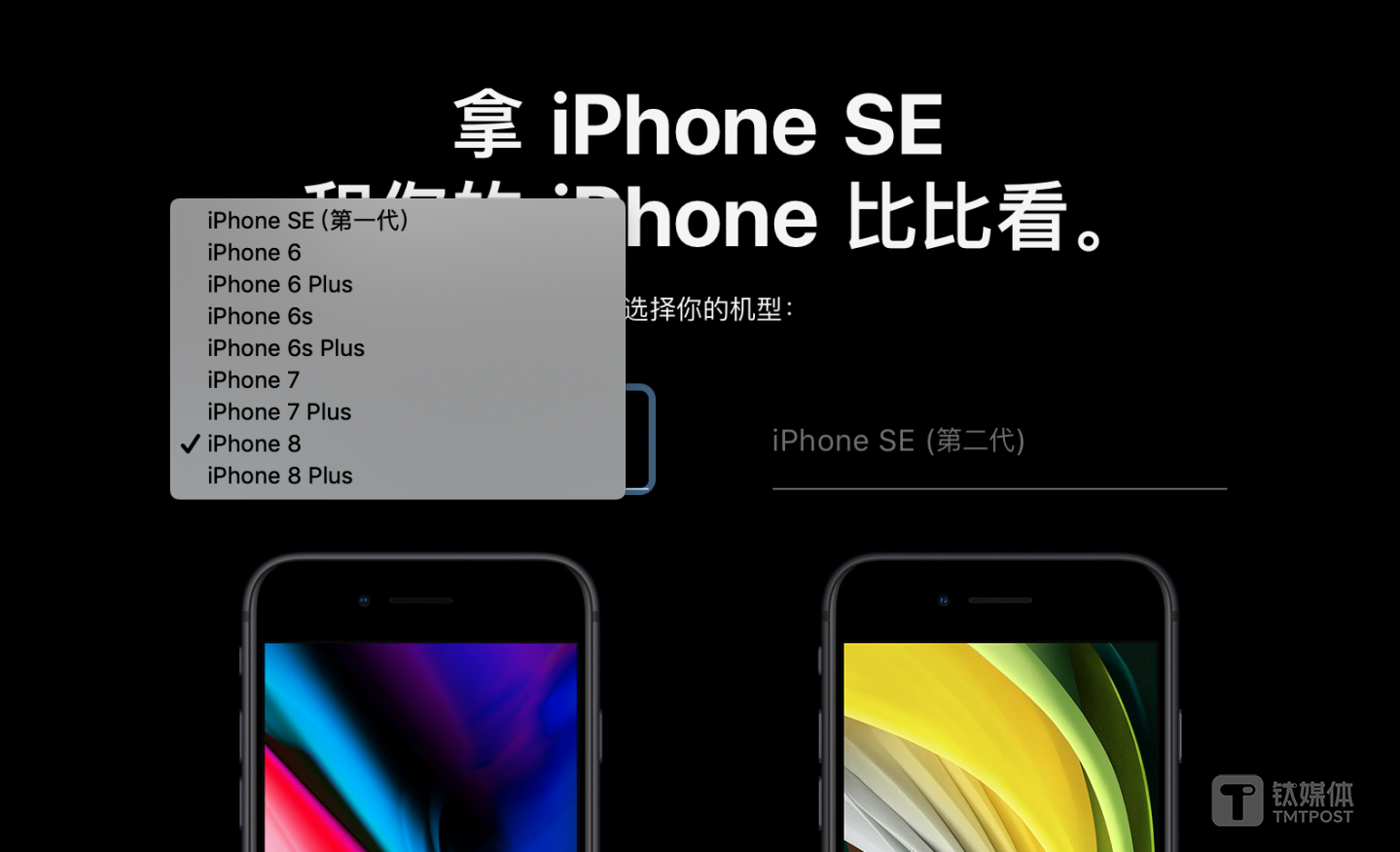 钛媒体从苹果官网iPhone SE的详情页发现,苹果提供给用户在网站打浏览选项当中,增加了与iPhone SE的对比机型,这些机型除了情理之中的 iPhone SE (第一代),还有iPhone 6、iPhone 7、iPhone 8三个系列的产品。