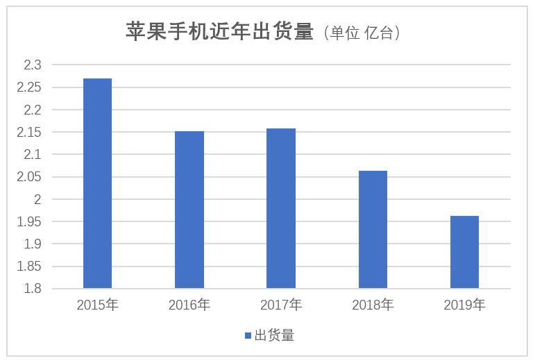 但如果将过去几年苹果手机的出货量连在一起观察,就会发现苹果的问题要严重得多。近5年来苹果手机出货量依次为:2019年为1.962亿台,2018年2.063亿台,2017年2.158亿台,2016年2.152亿台,而2015年高达2.27亿台,全球市场份额为17.5%。