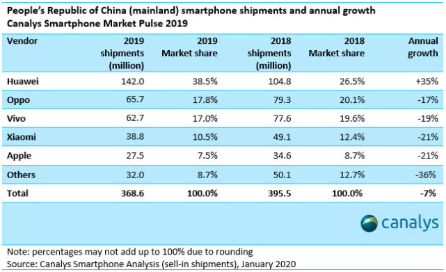 苹果在中国大陆市场上的销量下滑最为严重。数据显示,2018年苹果手机在中国大陆市场的总出货量为3420万台,比2017年的3670万台同比减少22%。2019年,中国大陆市场出货量2750万台,同比下跌再次超过了两成,市场份额也从8.7%降至了7.5%,只是勉强保住了前五的位子。