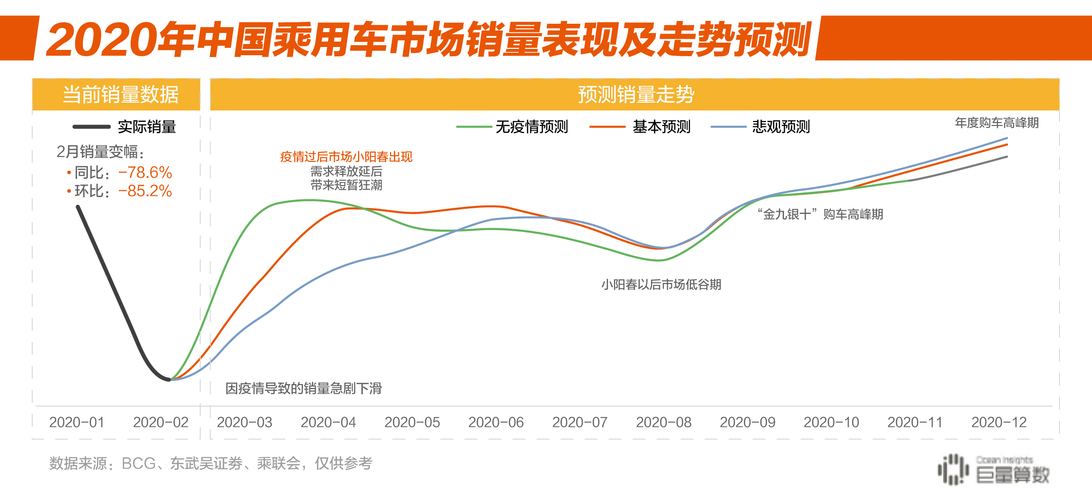 疫情期间,2020年2月中国乘用汽车市场销量同比大幅下滑为-78.6%,环比变幅为-85.2%。