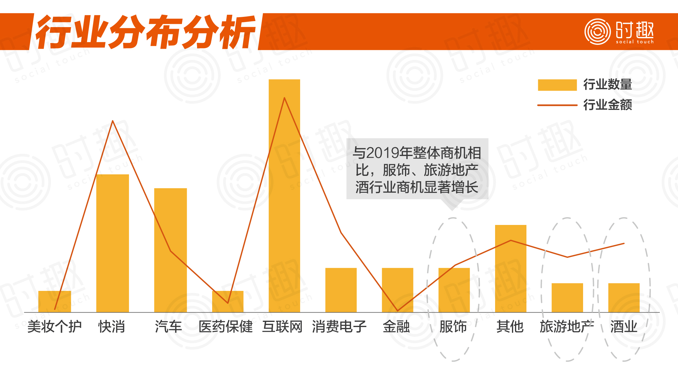 1、与2019年整体商机相比,向时趣咨询的服饰、旅游地产、酒行业的商机显著增长;在这个背后,是服装、地产、酒类这些营销和渠道模式相对传统的行业正在发生改变。