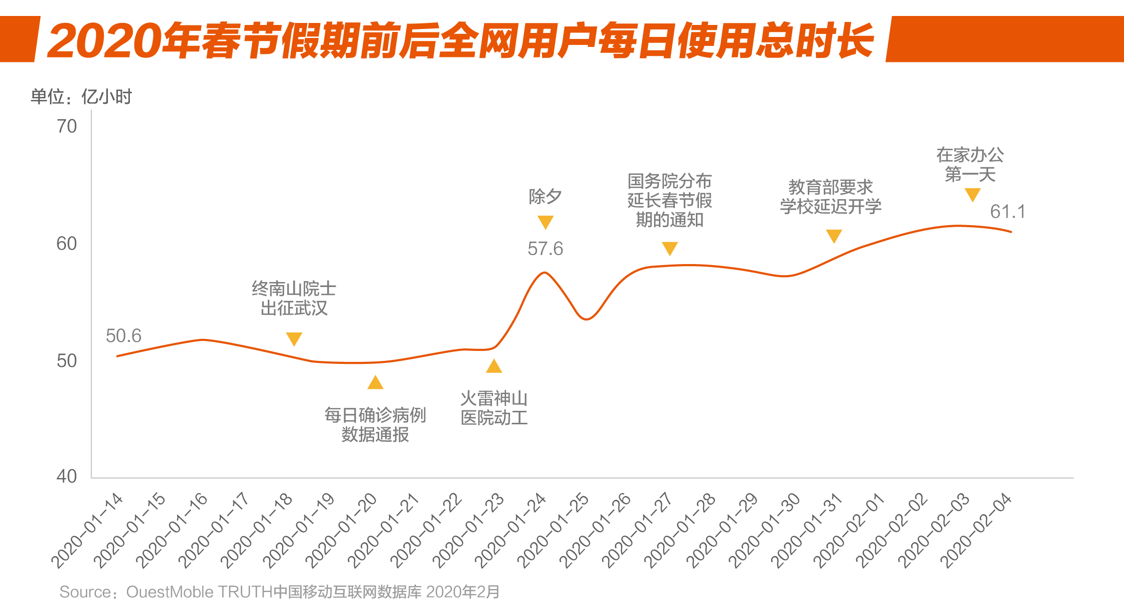 2. QuestMobile数据显示,从1月23日开始,全网用户每日使用总时长节节攀升,从原来的50亿小时,一路飙涨到61.1亿小时(2月3日,在家办公第一天)。各领域时长也发生了变化,视频、游戏两大领域占比上涨至38%,新闻资讯也上涨至9%。