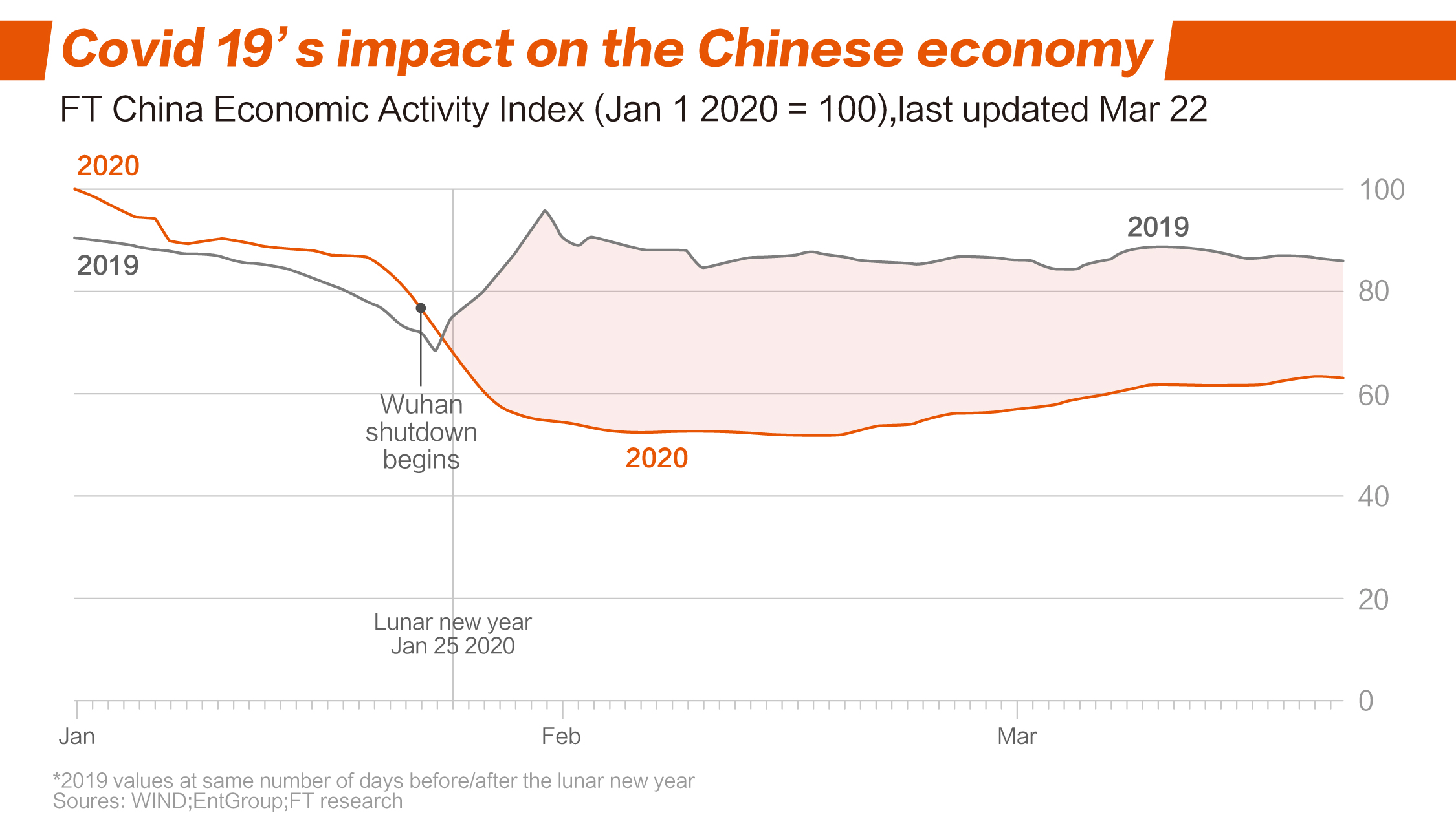 根据近期英国《金融时报》发布的数据显示,自2020年春节期间开始,中国经济下滑趋势明显,经济指数在60上下浮动,相对于2019年差距明显。