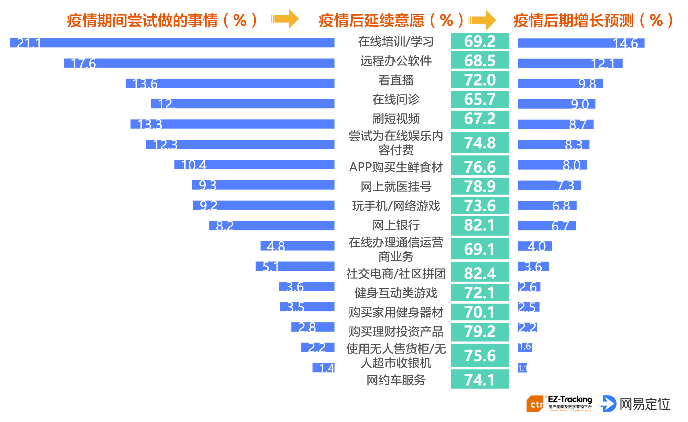 6.疫情之下,消费者愿意接受尝试新鲜事物。比如,在疫情期间用户对于在线培训、学习与远程办公的尝试最多,且疫后延续性较大,占比为69.2%,
