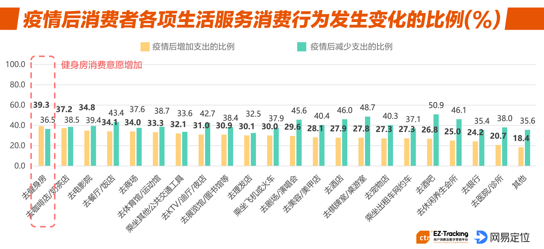 10.CTR数据显示,疫情期间,线下渠道使用率整体下降,但社区供销服务站及新零售体验店逆势上涨,社区服务增加比例达到53.8%。疫情过后,消费者在生活服务型消费支出方面整体较低,仅健身房消费意愿凸显,消费需求增加。