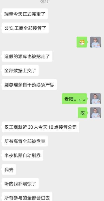 钛媒体快讯 | 4月27日消息:今日互联网上流传的一份截图显示,瑞幸咖啡被公安、工商全部接管,造假库源被挖走,全部数据上交。