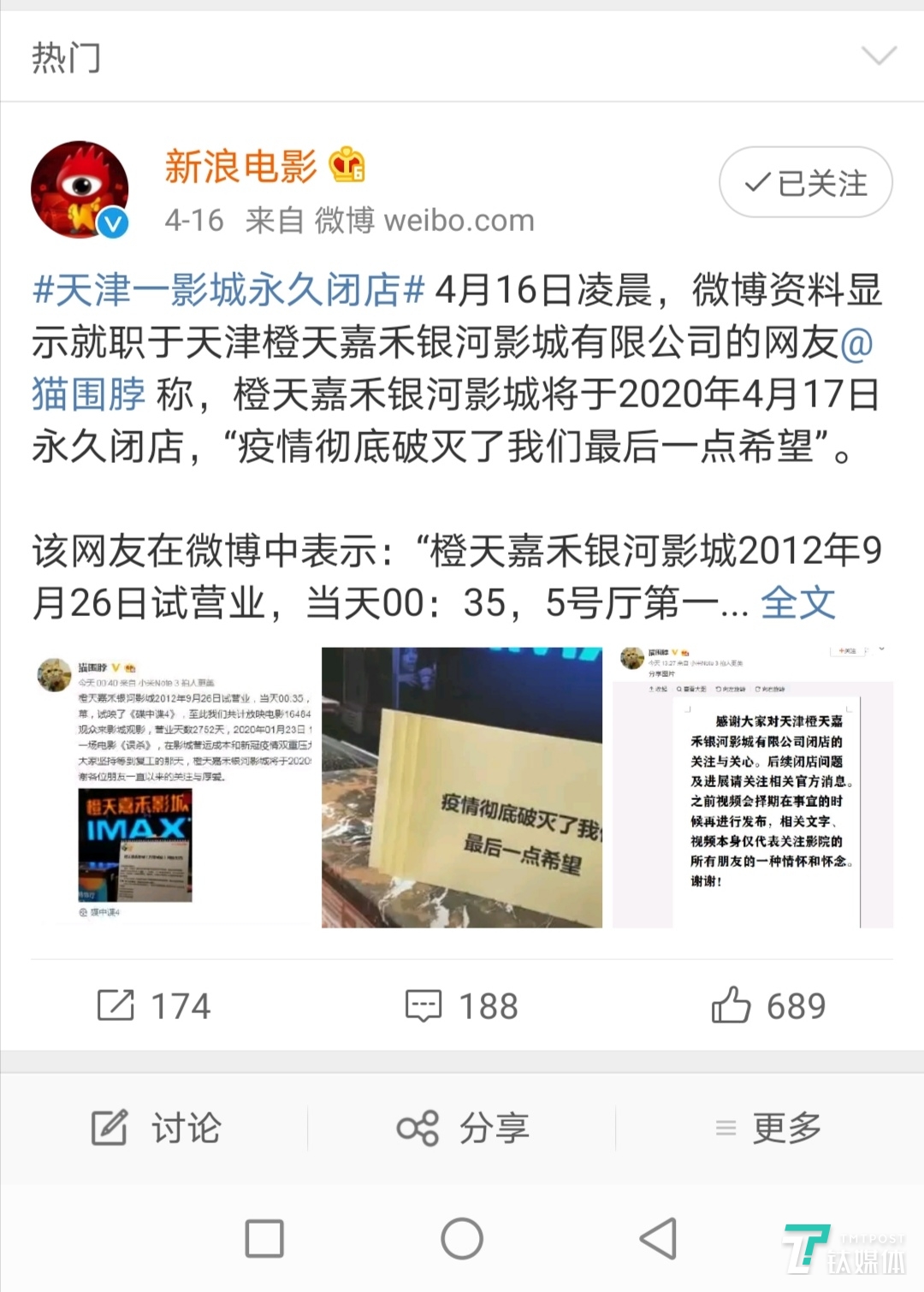 4月中旬,橙天嘉禾银河影城天津万象城店发布了闭店公告,基于营运成本和新冠疫情的双重压力,将于2020年4月17日永久闭店。