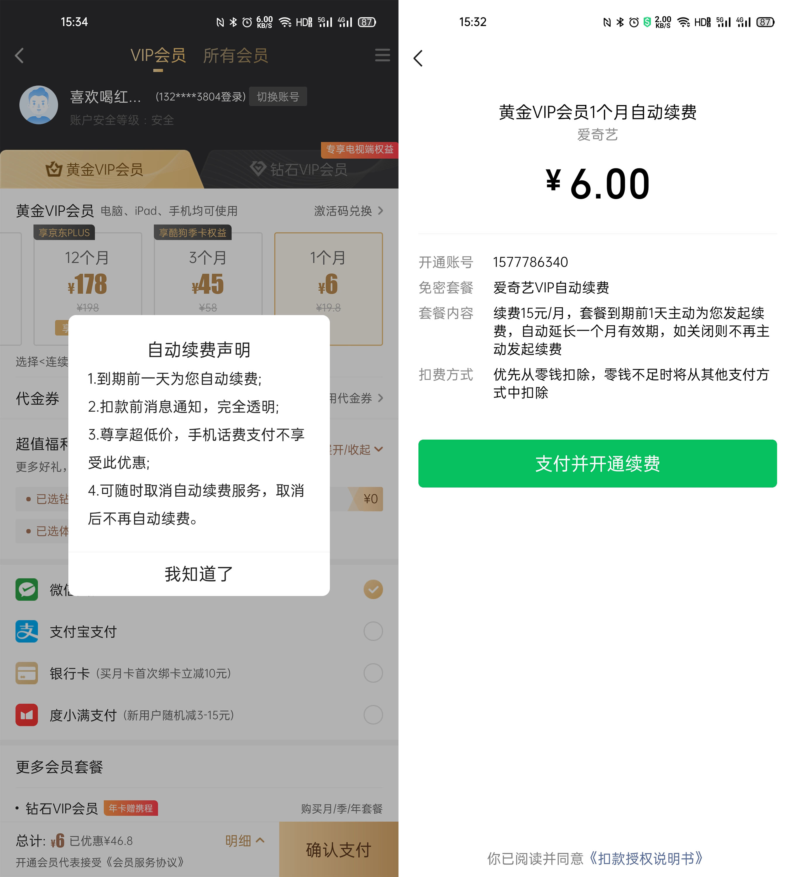 至于另一个整改的重点收费问题,从App的相关描述中,能明显看到改变。在需要付费的页面中我们可以明确见到运营方加入了相关说明,比如爱奇艺表示会在扣费前1天告知用户需要扣费,而且也会在续费界面指明哪些服务是“连续包月”,也就是会自动扣费。