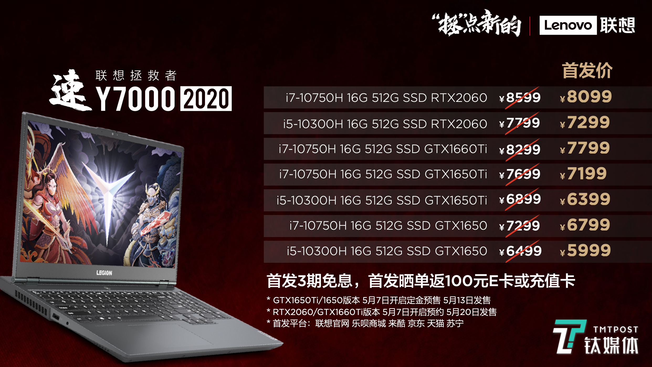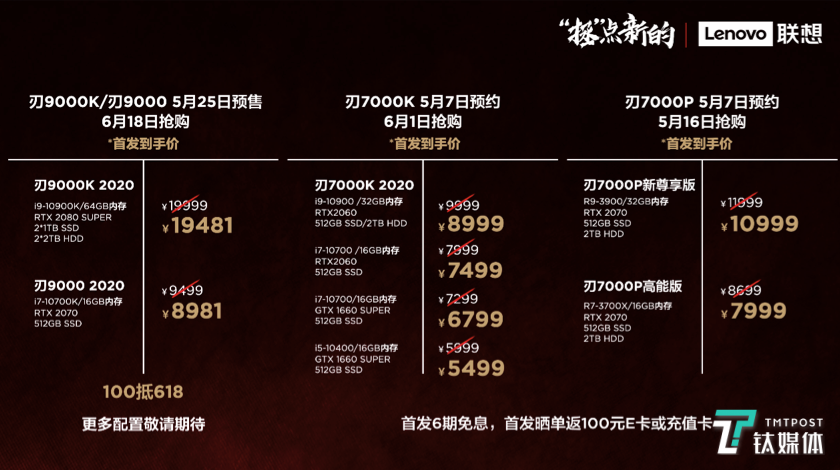 台机产品拯救者刃9000K/刃9000电脑5月25日预售,6月1日抢购,首发到手价分别为19481元、8981元,拯救者刃7000K电脑 5月7日预约 6月1日抢购,首发到手价5499元起,拯救者刃7000P 电脑5月7日预约 5月16日抢购,首发到手价7999元起。