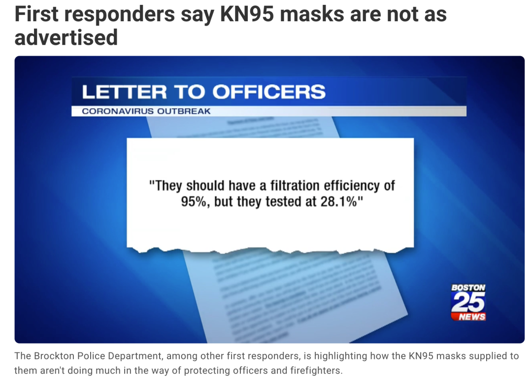 好景不长,美国布罗克顿警察局在数周前,指出他们进口的中国KN95口罩,过滤度经过测试仅有28.1%,离95%相差甚远。远远起不到保护一线警务人员的作用。
