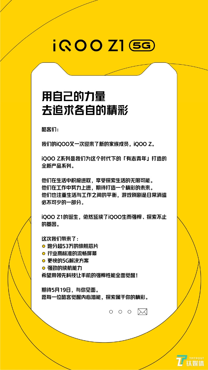 随后,iQOO官方也发布消息,将在5月19日发布首发搭载天玑1000+的新机iQOO Z系列。