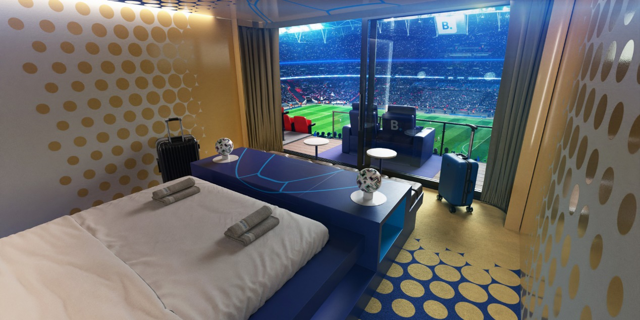 更有想象力的操作原本应该在今年的欧洲杯期间出现。承办决赛的温布利大球场和欧洲杯官方赞助商Booking合作,推出了球场内主题房加看球的神奇套餐,脑洞简直爆棚。