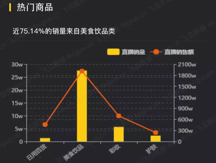 吃货人设的陈赫自然有不少吃货粉丝,据飞瓜数据显示,在直播商品中美食类的销售额近2000万,占到成交额的四分之一。