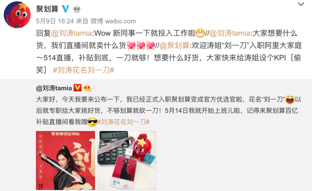 而谈单商品的优惠力度,刘涛入场直播带货,就在这个上面做了文章,宣布担任聚划算首席优选官并以“刘一刀”ID入职阿里,“刘一刀”用意很明确,旨在帮助用户向商家最大力度砍价,让“刘一刀直播”成为全网低价的代名词。