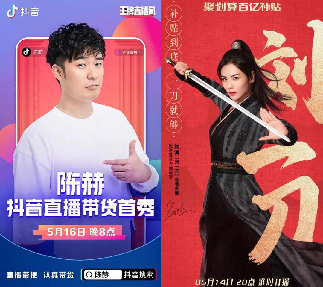 在陈赫首秀的两天前,5月14日,以《欢乐颂》《琅琊榜》等为代表作的国民演员刘涛也同样贡献了自己的全场直播带货首秀。刘涛先是宣布担任聚划算首席优选官,以“刘一刀”ID入职阿里,网传年薪百万,并于5月14日在淘宝直播开启首次带货直播,交出三小时1.48亿,总引导进店人次达4377万的战绩单。当晚,刘涛直播的话题霸屏多个平台热搜。