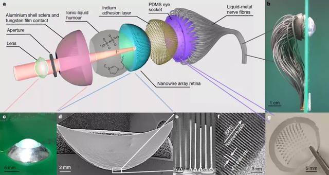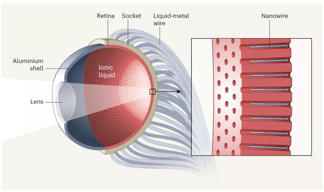 为了制造高分辨率人工视网膜,范智勇教授及同事展示了一种新设计:一种半球形的氧化铝上包含了紧密排布的钙钛矿光敏纳米传感器,模仿人眼的视网膜(钙钛矿是一种颇具潜力的太阳能电池材料)。同时,他们还使用由液态金属制成的传导线将人工视网膜上的光血信号传导出来。