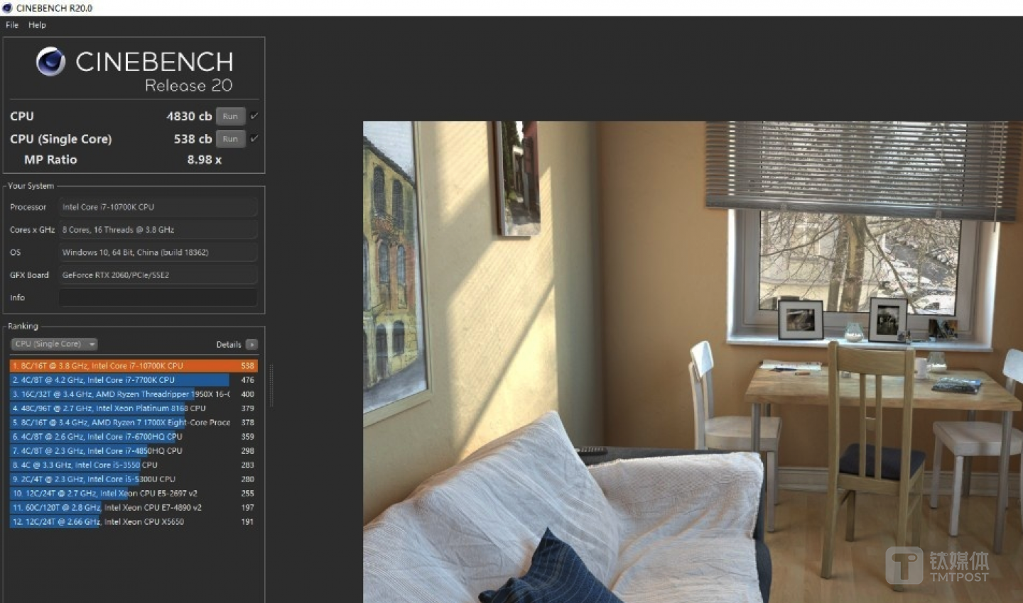 从测试结果我们可以看出,Intel Core i7-10700K处理器多核测试方面,得分为4830cb,单核得分为538cb,这样的得分高出其他主流配置不少,相较于上代同级产品,得益于频率及多线程的加成,不管是单核性能还是多核性能都有明显的提升。