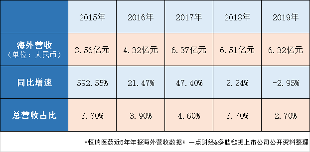 近两三年是恒瑞医药提出国际化开拓最密集的时期,但至少从财务报表上看,其不但没有在海外市场有所斩获,反倒在2019年出现2.95%的海外营收降幅。