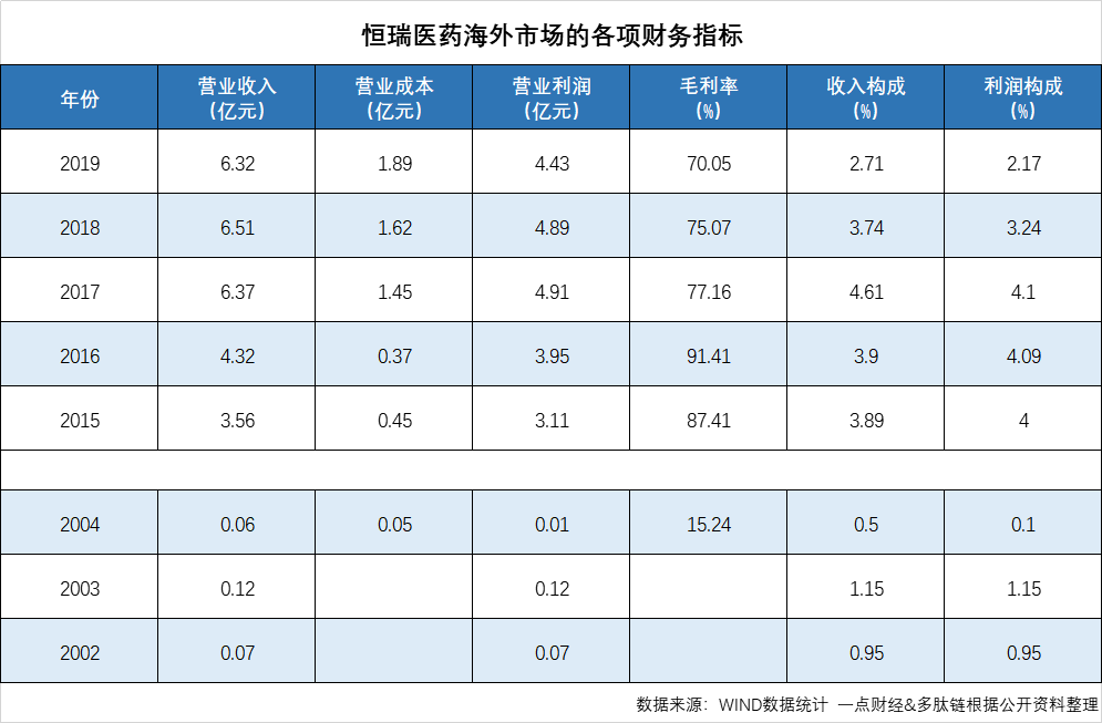 2019年报显示,恒瑞医药海外市场的营业收入为6.32亿元,仅占比其总营收的2.71%,这个数据与226.15亿元的国内营收相比就是个“零头”。