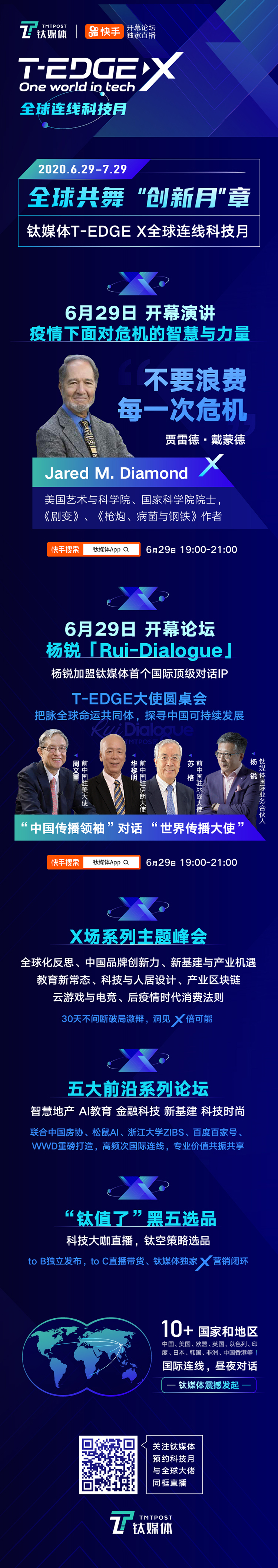 从明天(6月29日)开始,钛媒体将联合中外各大合作伙伴一起,正式发起一场长达一个月的 ONE WORLD IN TECH 全球思想狂欢。T-EDGE X, X是“不被定义”,“不被束缚”的力量。本次活动也得到了快手的大力支持,通过快手本次思想盛宴也将传播到更广泛的大众之中。 6月29日~7月29日,下载钛媒体App客户端守候全新上线的“前沿直播间”(EDGE Live )https://www.tmtpost.com/event/t-edge/2020summer/index_ch.php ,或者快手上搜索官方账号“钛媒体App”,在那里,每天可能都会发生让你意想不到的世界级连线。