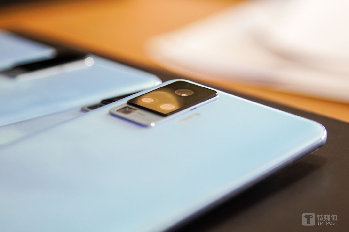 阶梯式设计更有层次感和秩序感,第一阶为承载主摄、人像和广角的高阶梯,采用的是经典专业的黑色,第二阶为承载潜望的中阶梯,采用了与电池盖(第三阶梯)CMF相呼应主题色。