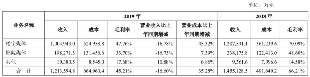 分众传媒2017年、2018 年、2019 年分别实现营业收入 120.14 亿元、145.51 亿元、121.36 亿元,归属于母公司所有者的净利润分别为 60.05 亿元、58.23 亿元、18.75 亿元,平均销售毛利率分别为 72.72%、 66.21%、45.21%,销售净利率分别为 50%、40%、15%。