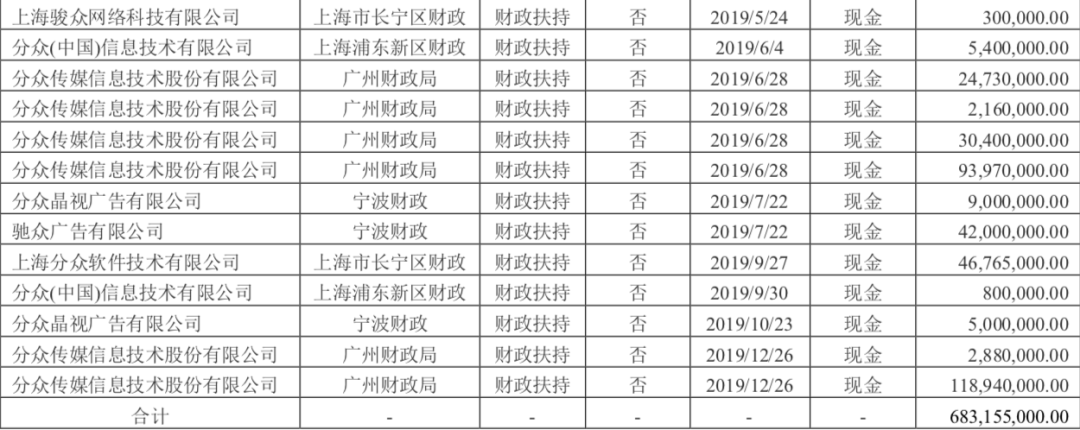 分众传媒2019年共计收到政府补助6.83亿元,全部以现金形式给付。
