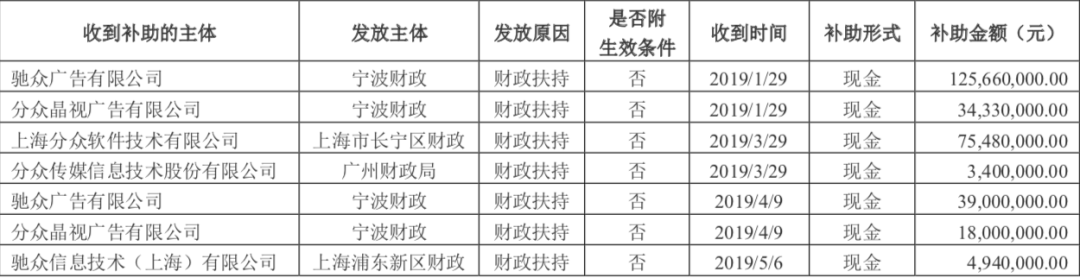 分众传媒在回复函中详细列出了2019年收到的所有政府补助。