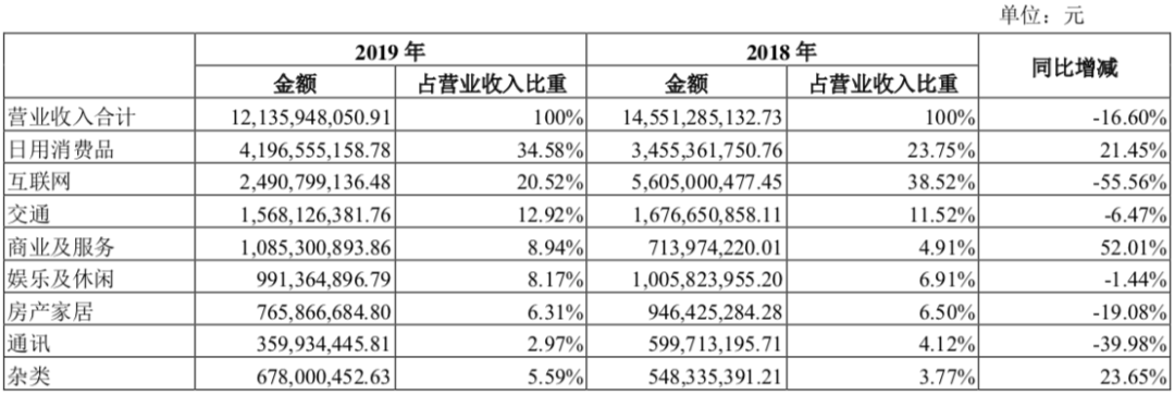 不过,虽然互联网业务有大幅下跌,但是日用消费品和商业及服务分别上涨21.45%、52.01%。