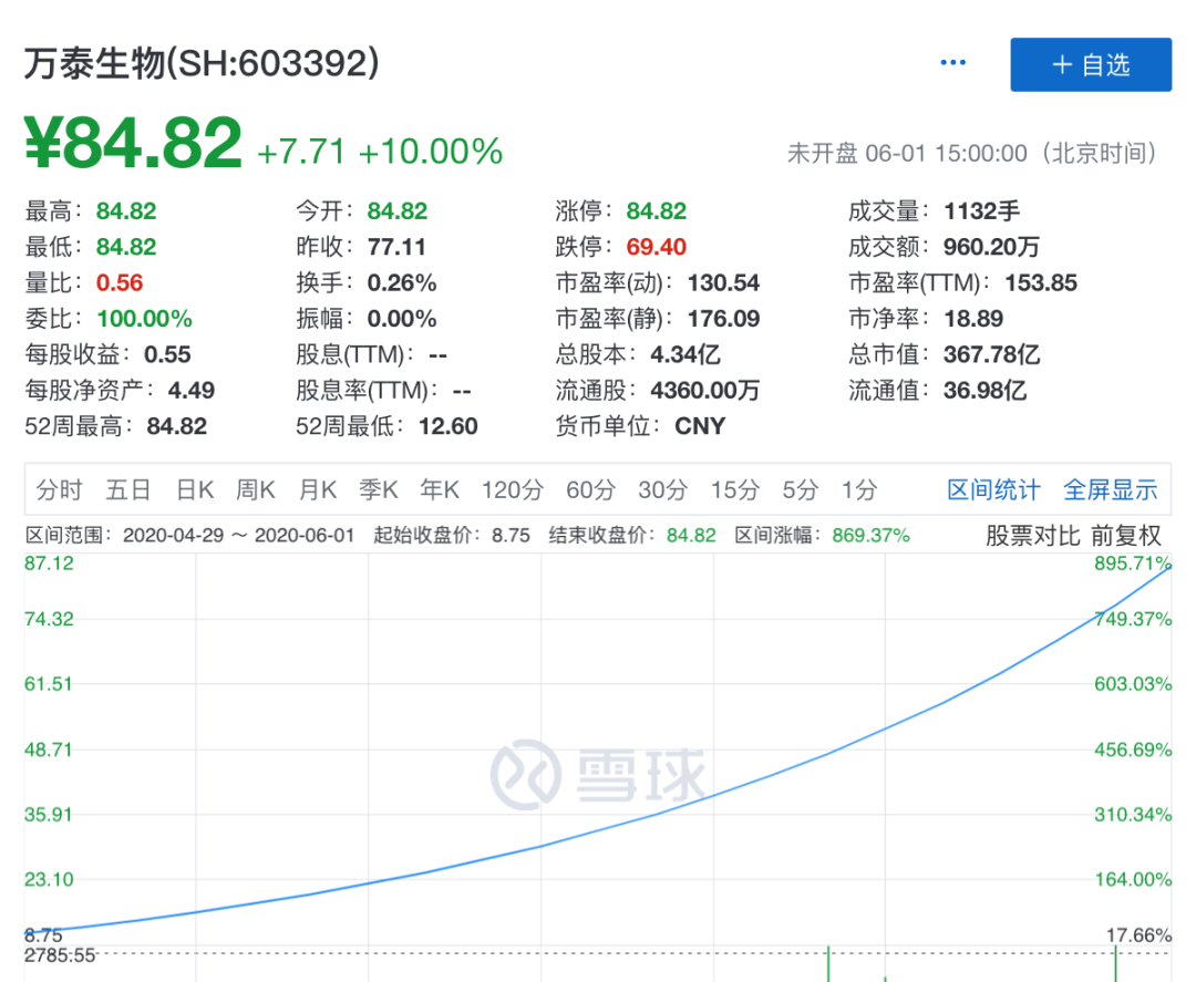 1个多月的时间,21个涨停,股价从8.75元上涨至84.82元,涨幅接近9倍,而且还没停下,万泰生物有可能成为2020年涨得最多的新股。这,也远远超过2018年时药明康德16个涨停和接近5倍的涨幅。