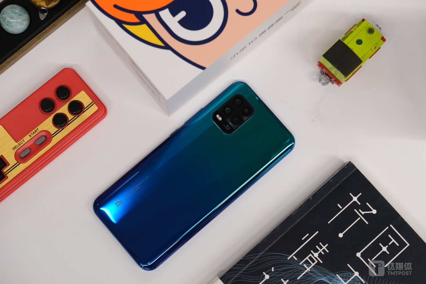 而笔者手上拿到是蓝绿渐变的蓝莓薄荷配色——底部配色是偏蓝色,而手机顶部则是偏绿色。背面左上角印有“MI”字logo,右上角则是四摄矩阵,印有“50X”和“AI”。这暗示着这款手机既支持AI拍摄,也支持50倍数码变焦。