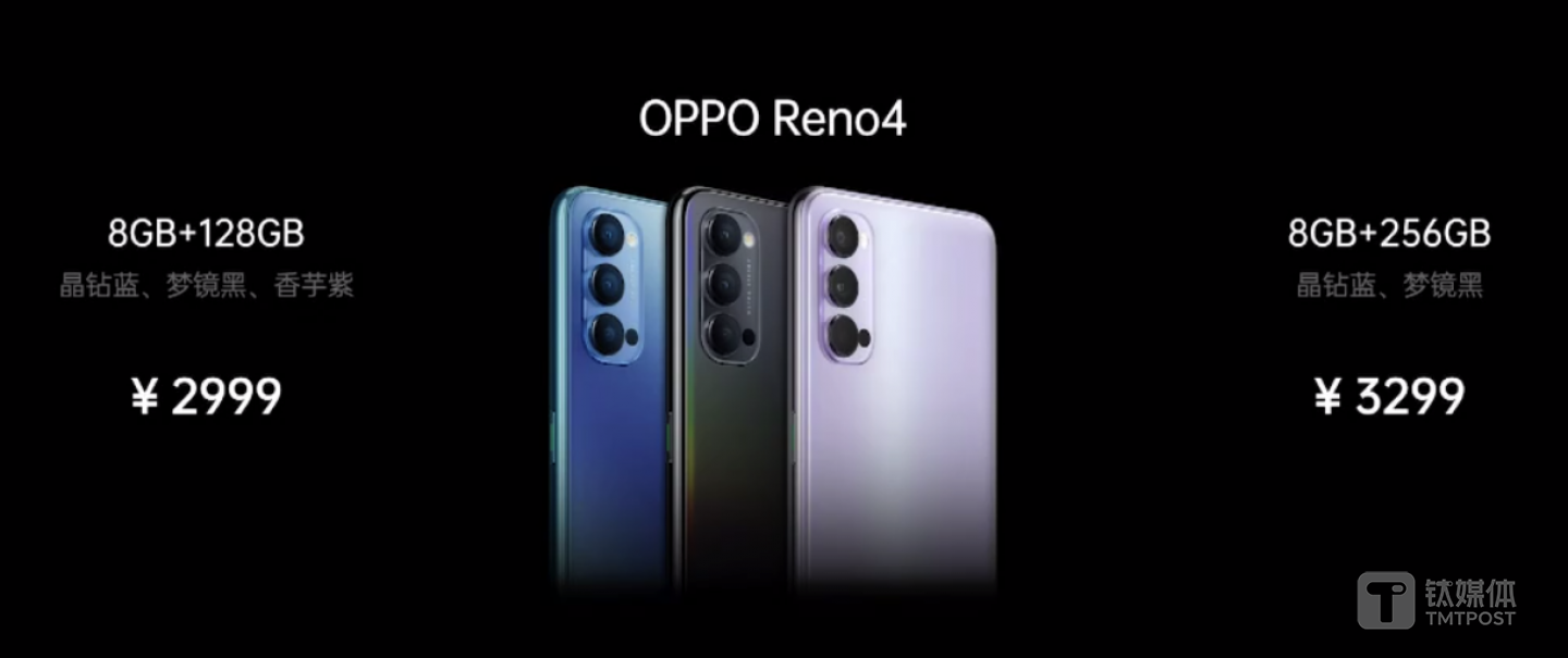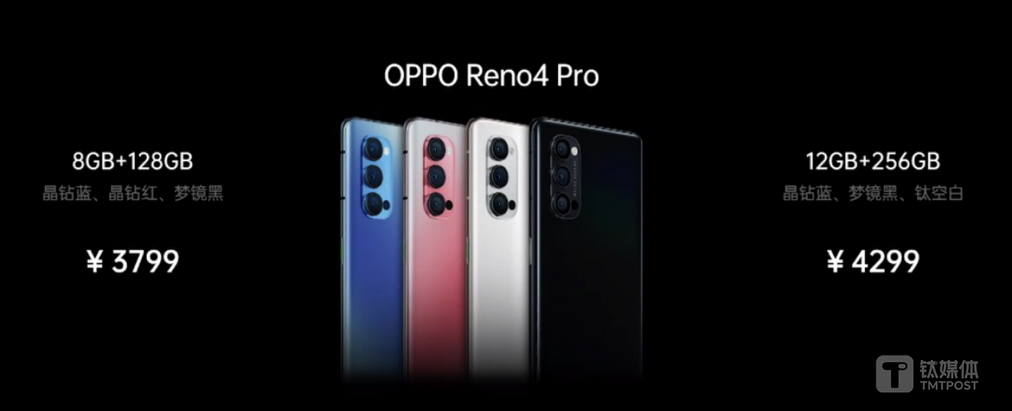 售价方面,OPPO Reno4 8GB+128GB售价为2999元,8GB+256GB售价3299元。OPPO Reno4 Pro的8GB+128GB版本售价3799元,12GB+256GB版本售价4299元。
