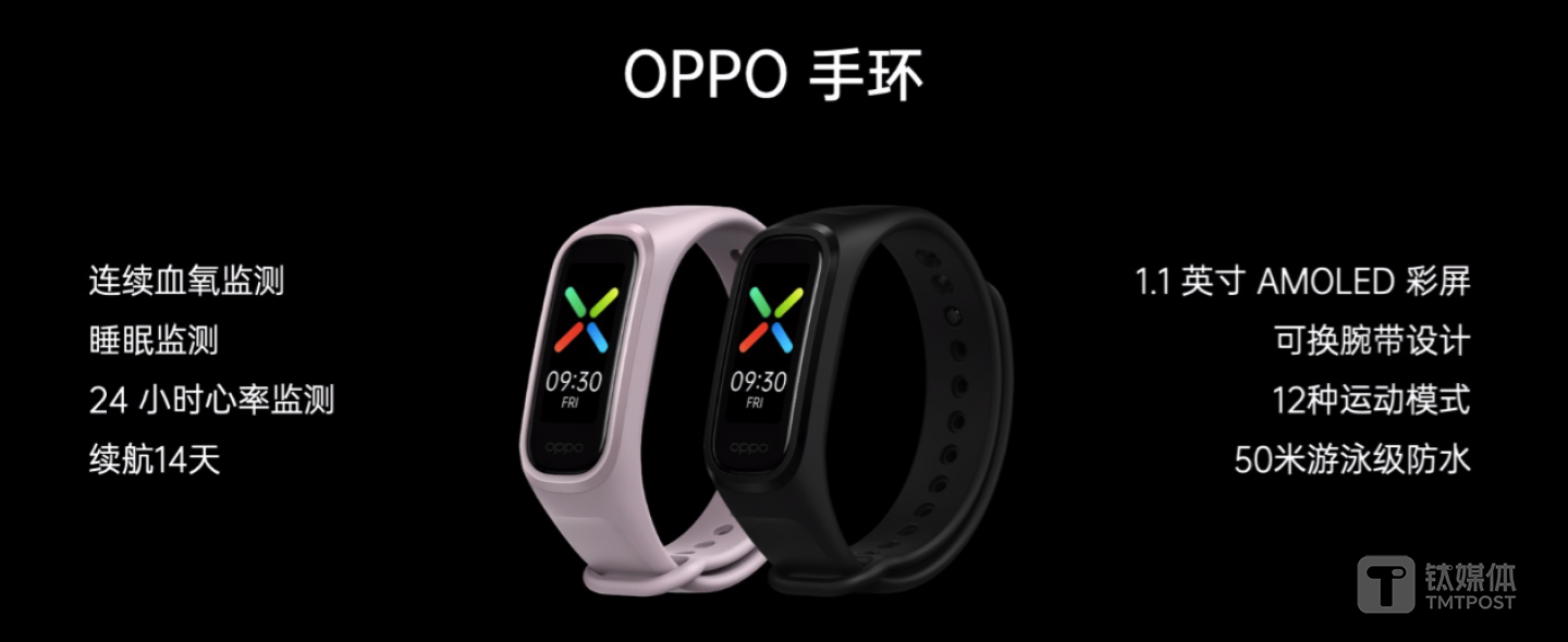 OPPO手环则主打运动健康,支持连续血氧检测、12种运动模式,最长待机可达14天,共有时尚版和标准版两种选择,售价分别为249元和199元。