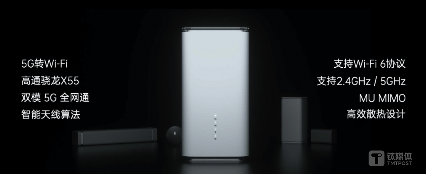 最后,OPPO 5G CPE T1也在国内正式发布。它搭载高通骁龙X55 5G芯片、支持最新的Wi-Fi 6技术,只需要插入5G SIM卡,T1就可以将5G信号转换成高速Wi-Fi信号,售价为1999元。