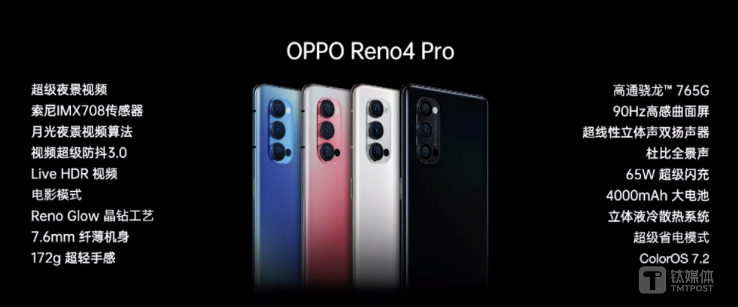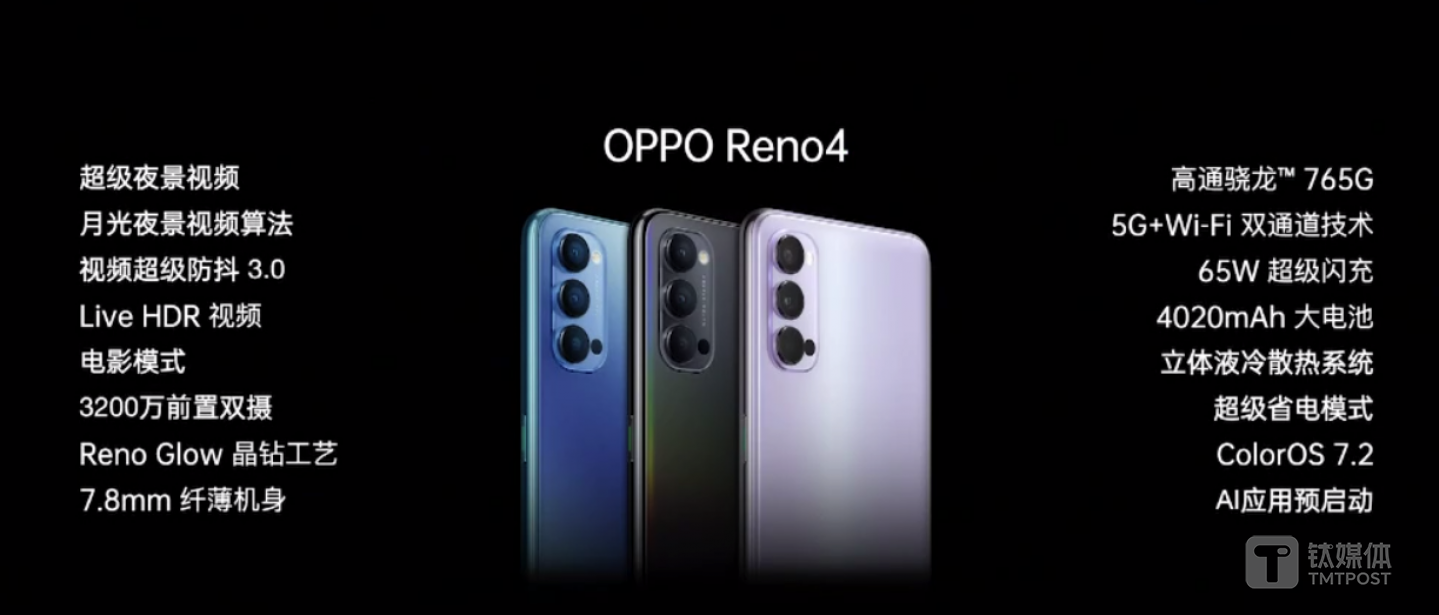 此次发布会上,OPPO还发布了OPPO Reno4,同样搭载高通骁龙 765G 5G芯片及65W超级闪充;后置搭载4800万+800万+200万超清激光对焦三摄,前置双摄为3200万+200万组合,同样具备超级夜景视频、视频超级防抖3.0等视频拍摄功能。
