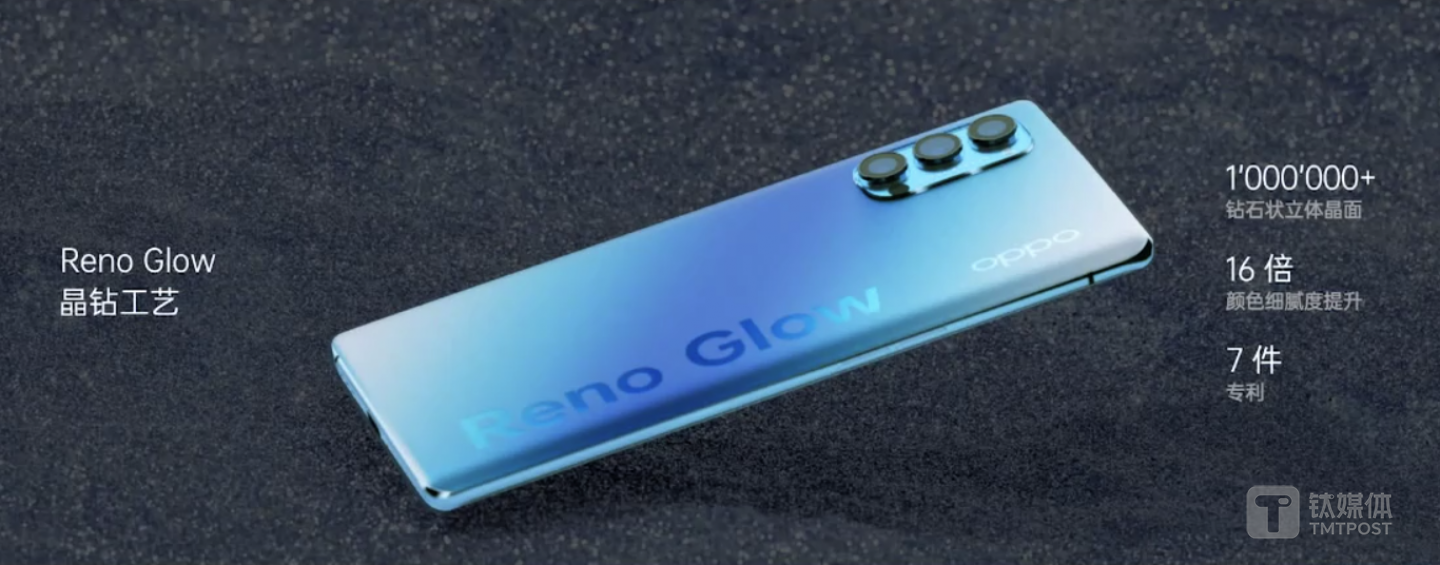 设计方面,OPPO Reno4系列还首发全新的Reno Glow晶钻工艺,机身后盖有百万级钻石状立体晶面细密分布,能既保留机身色彩的细腻与亮度,同时又不沾指纹、更耐磨。