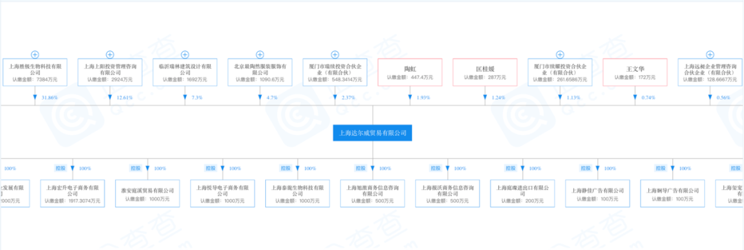 企查查数据显示,在达尔威前三大股东中,上海广鹏投资管理咨询有限公司持股35.18%、上海胜极生物科技有限公司持股31.86%、上海上阳投资管理咨询有限公司持股12.61%。第五大股东引人注目——北京最陶然服装服饰有限公司占股6.88%,这家公司控股人正是演员陶虹,同时陶虹也是达尔威的董事,个人持股1.93%。