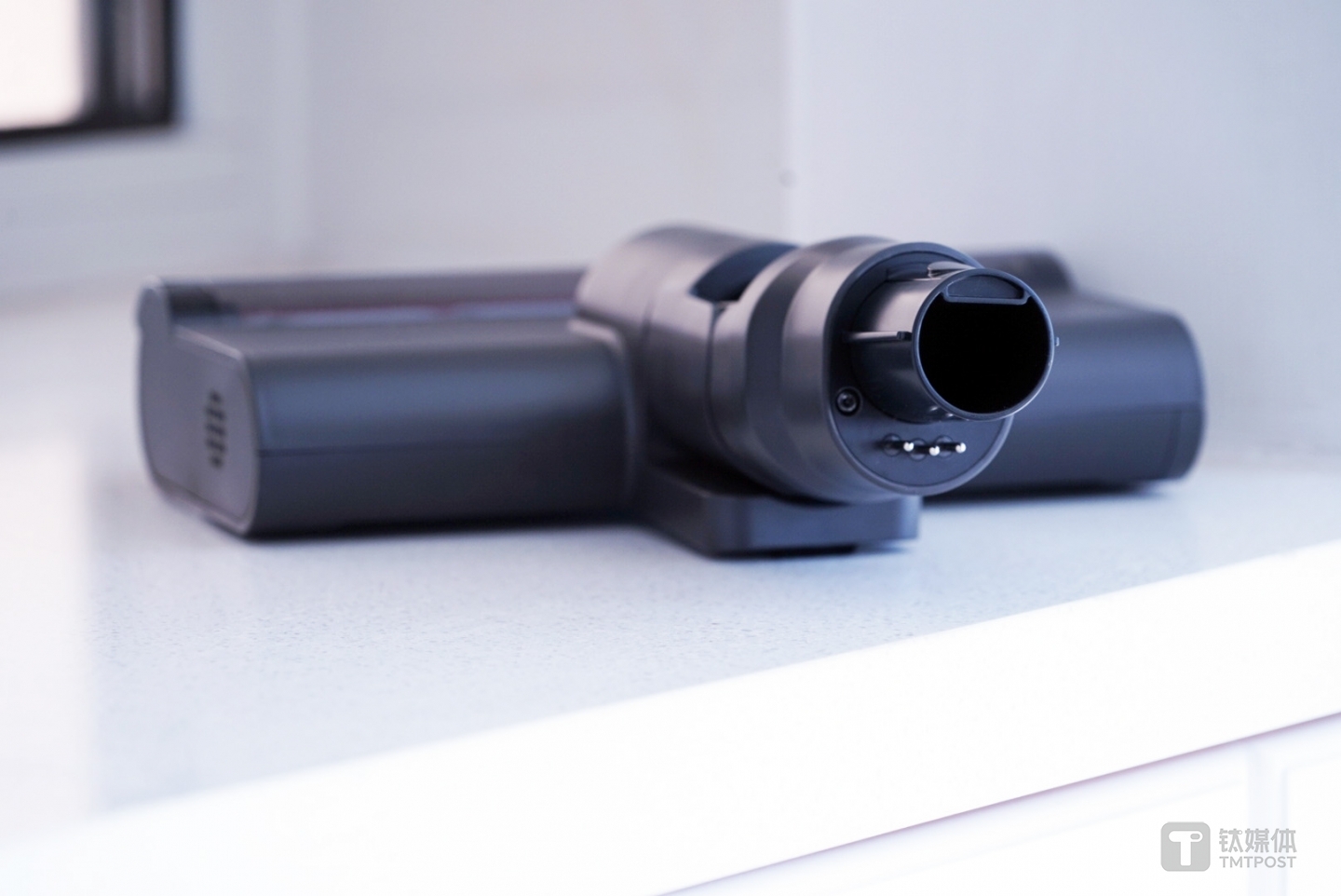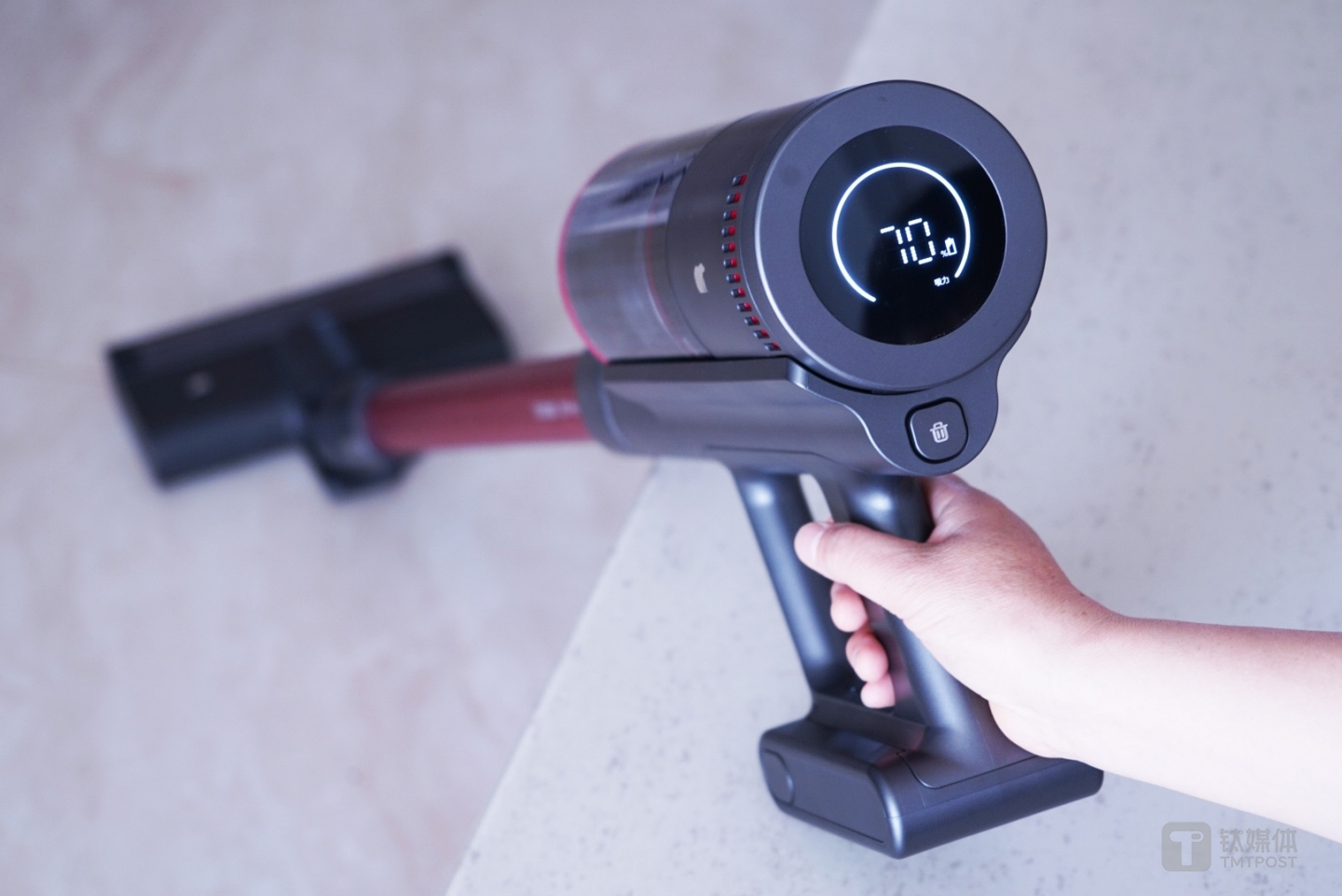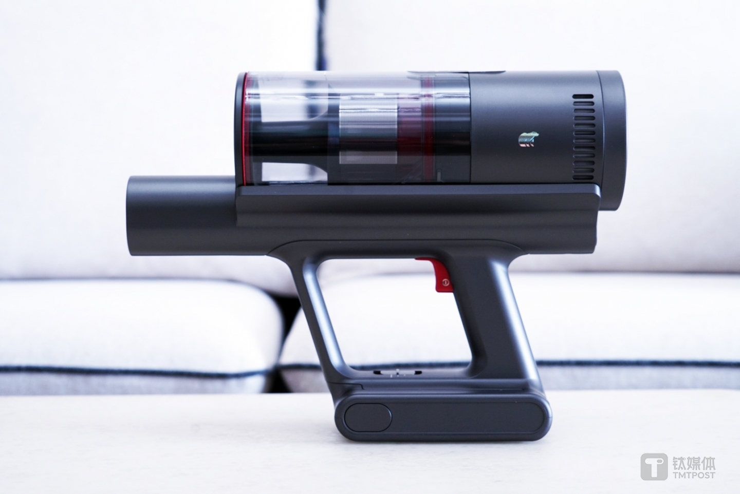 钛媒体拿到的这款Z11 Pro无线吸尘器采用灰色的极简风格设计,采用波尔多红酒酒瓶式设计,而灰色在欧式家装环境中是代表着高端,一方面显得非常有质感,另一方面能很好融入家居场景。