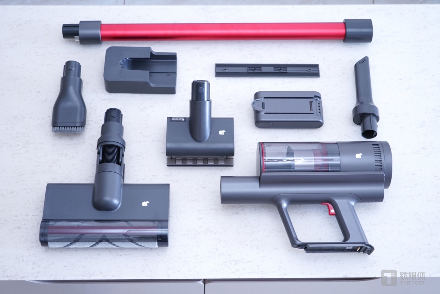 打开外包装,会发现内部整齐地排列着各种零部件,包含了吸尘器主机、延长杆、电池、专利防缠绕地刷、点动除螨刷、窄缝吸头、毛刷、充电挂座、适配器等十个零部件,相对来说还是非常全面的。