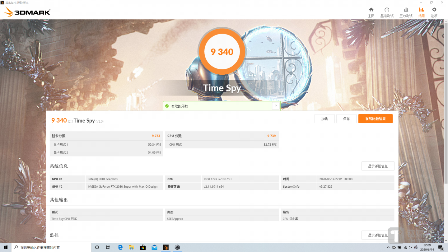 在3Dmark的Time SPY测试环节中,整机的得分达到了9340分,即使放到桌面级平台,这也是一个较为不错的成绩,游玩最新的3A大作完全没有问题。