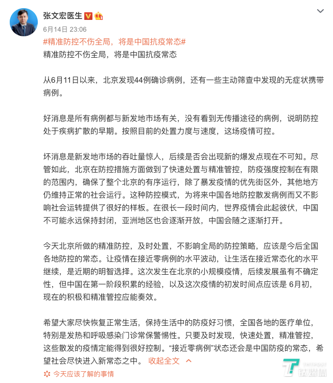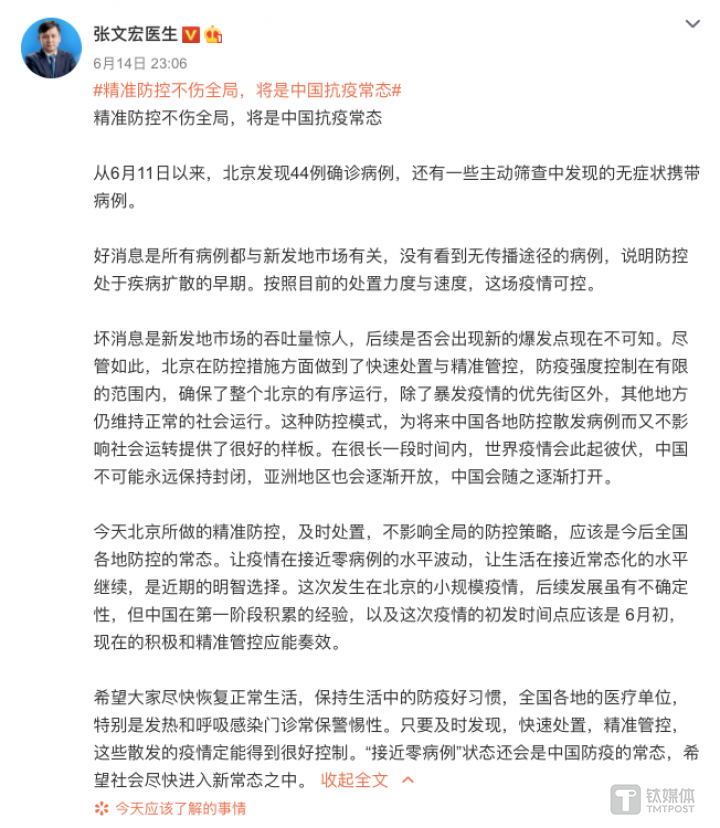 钛媒体快讯 | 6月15日消息:昨日晚间,复旦大学附属华山医院感染科主任张文宏医生发微博谈及北京疫情时称,目前有一个好消息,一个坏消息。