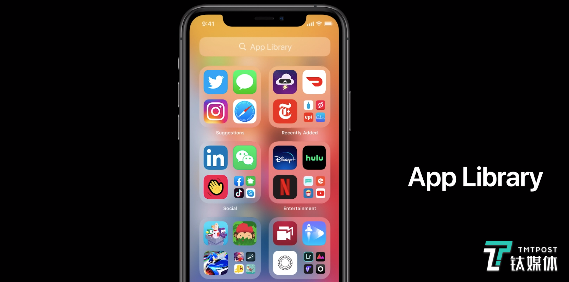 所谓的App Library就是将你所有的应用集合在一起,并且加入了智能整理功能——将同一类app归档整理在一起。比如,你下载的游戏应用会归类到一个文件夹里面,聊天应用归类在一个文件夹里。